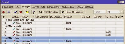 /ip firewall mangle add chain=prerouting \protocol=icmp action=mark-connection \new-connection-mark=PING_STABIL \passthrough=yes comment="PING_STABIL" \disabled=no